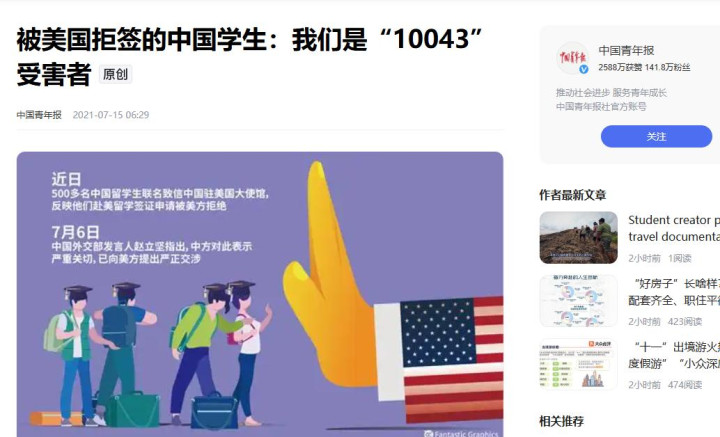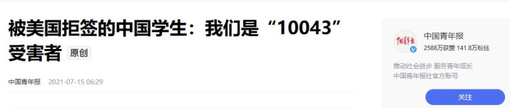3.《被美国拒签的中国学生:我们是“10043”受害者》中国青年报2021-07-15 06:29