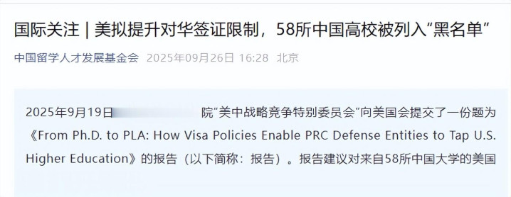 1.《国际关注|美拟提升对华签证限制,58所中国高校被列入“黑名单》中国留学人才发展基金会 2025年09月26日16:28 北京